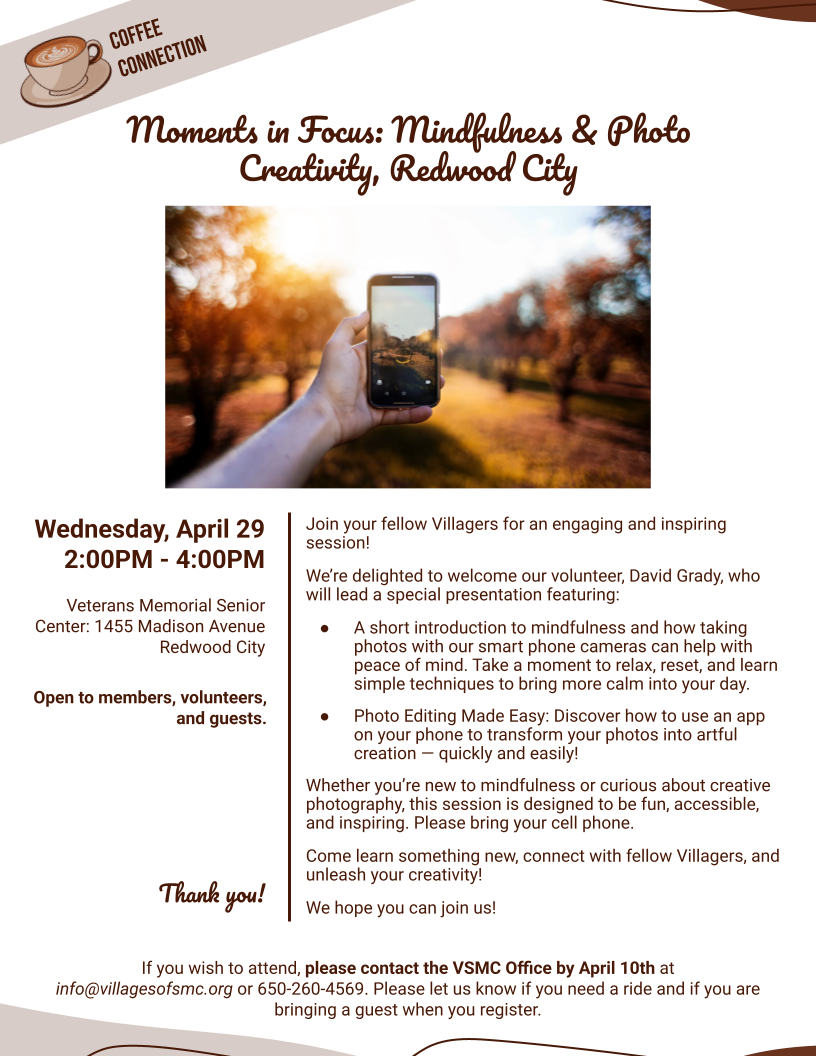 Wed Apr 29 Coffee Connection - Moments In Focus: Mindfulness & Photo Creativity 2:00 PM- 4:00 PM